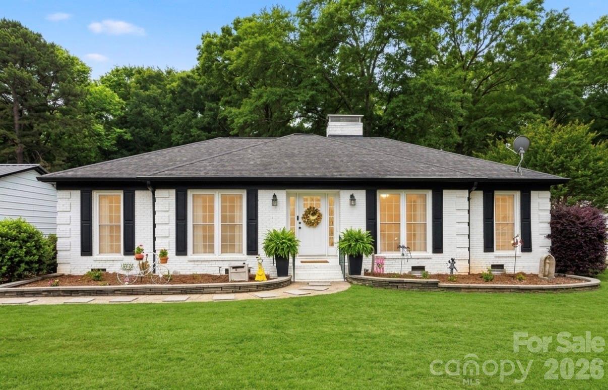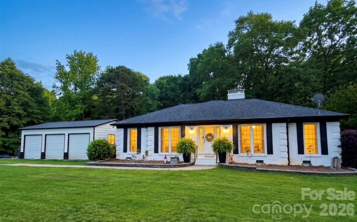 This classic brick ranch is situated on a sprawling 2-acre lot with no HOA, offering expansive outdoor space and a detached 3-car garage. The property is located within the highly sought-after Indian Land school district and is conveniently positioned minutes from Ballantyne, Pineville, and Fort Mill. The home has been updated throughout, including the crawl space. The traditional floor plan features an entryway, a sitting room or office, a formal dining room, and a spacious kitchen equipped with a gas stove, quartz countertops, and a breakfast area. Adjacent to the breakfast area is a cozy den with a brick fireplace that leads to a sunroom overlooking the large, fenced backyard. The opposite wing of the home includes the primary bedroom with an updated full bathroom, along with two additional bedrooms and a second full bathroom.