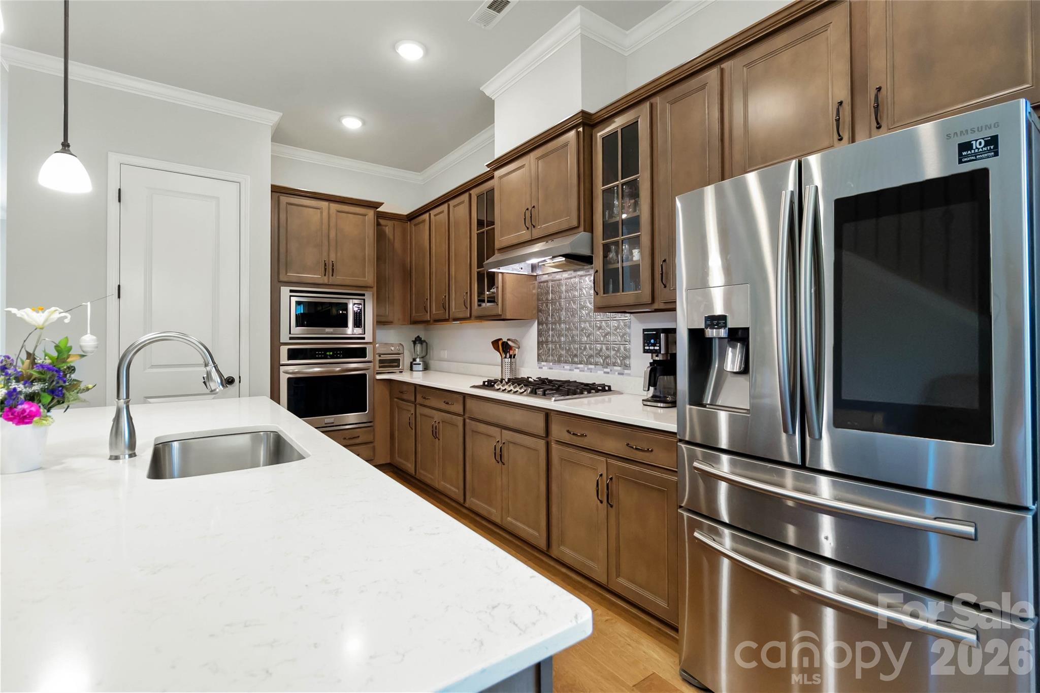 Welcome to this beautifully crafted brick home, ideally situated on a rare, oversized lot in sought-after Eden Hall—just minutes from Downtown Matthews. Designed for both everyday living and entertaining, the open floor plan features 10’ ceilings, abundant natural light, and hardwood floors throughout the main living areas. A flexible front room provides the perfect space for a home office, music room, play room, or sitting area. The gourmet kitchen is the centerpiece of the home, offering quartz countertops, stainless steel appliances, gas cooktop, glass-front cabinetry, and a large island that flows seamlessly into the dining area and great room. The great room with gas fireplace opens to a balcony that overlooks the backyard trees. The oversized main-level primary suite delivers convenience and comfort, featuring a spa-inspired bath with a large tiled walk-in shower, transom window, and dual vanities. Large walk-in closet has direct access to the laundry room, complete with folding station. Upstairs, a spacious loft creates an ideal secondary living area, complemented by a private guest suite with ensuite bath plus an additional bedroom with access to a full bath with tiled walk-in shower. A large walk-in attic provides excellent storage or future expansion potential. Enjoy outdoor living from the covered rear balcony overlooking a fenced yard and wooded backdrop—offering both privacy and usable space rarely found in the neighborhood. HOA-maintained lawn care, landscaping, and irrigation allow for low-maintenance living in a prime location close to shopping, dining, and community amenities. Don't miss this opportunity - schedule your showing Today!