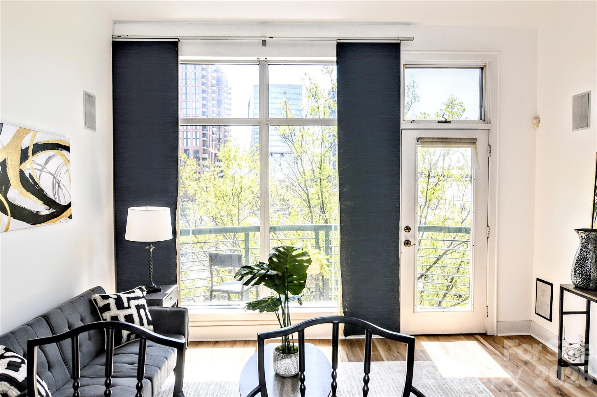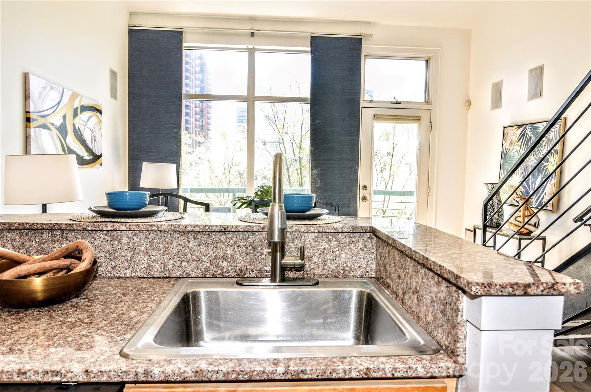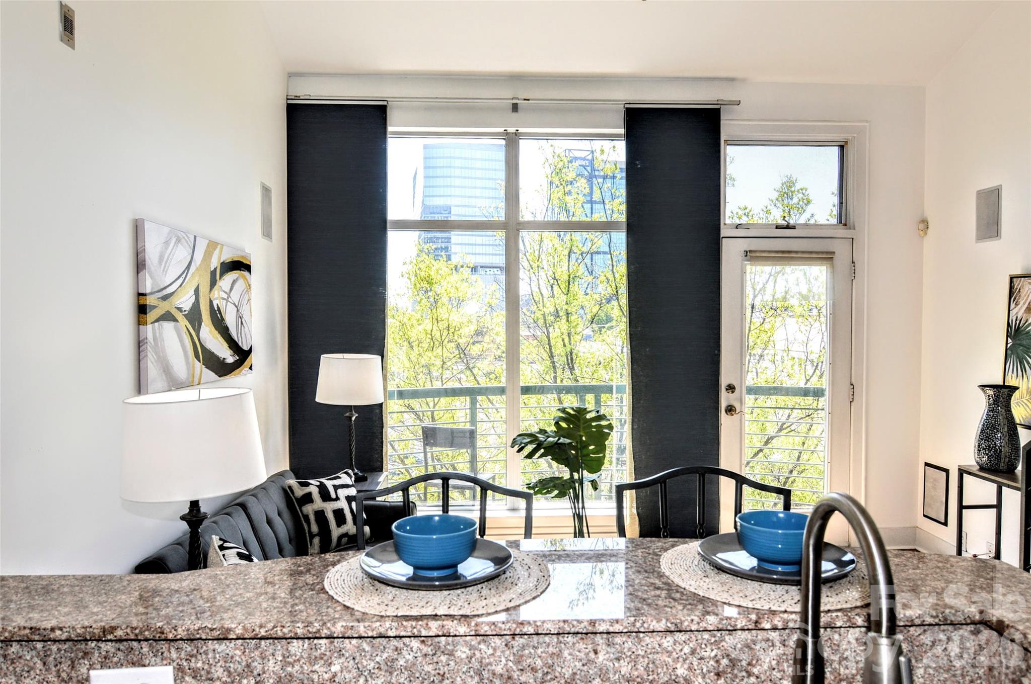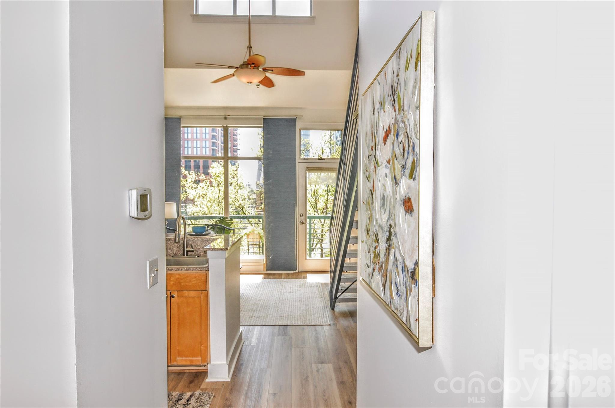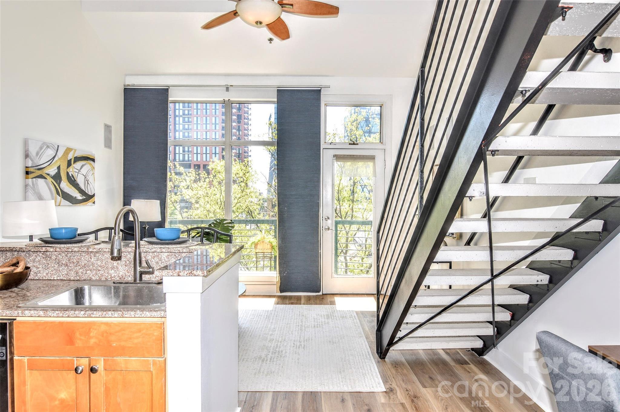 The ULTIMATE South End location! Just steps from the Rail Trail and some of Charlotte’s most popular restaurants and nightlife, this top-floor 1-bedroom, 1-bath condo offers the perfect blend of convenience and privacy. Located on the 4th floor with easy access from the parking garage, this freshly updated unit features soaring ceilings and dramatic floor-to-ceiling windows that flood the space with natural light. The open-concept living area flows seamlessly into the kitchen, complete with wood cabinetry, stainless steel appliances, and a breakfast bar with stone countertops. Enjoy your morning coffee or unwind in the evening on the private balcony overlooking vibrant South End activity. The main level includes a welcoming foyer with a convenient storage closet, a laundry closet with brand new GE stackable washer and dryer, and a beautifully updated full bathroom featuring tile flooring, a stone countertop, a fresh vanity, and a modern backlit LED mirror. Upstairs, the lofted bedroom offers a spacious built-in closet system designed for maximum organization. Residents also enjoy access to a stunning rooftop terrace with unbeatable Uptown views—perfect for entertaining, working remotely, or simply relaxing. Freshly painted and brand new flooring throughout, this move-in ready condo is a rare opportunity in one of Charlotte’s most sought-after locations. Don’t miss your chance at this great condo to work and live!