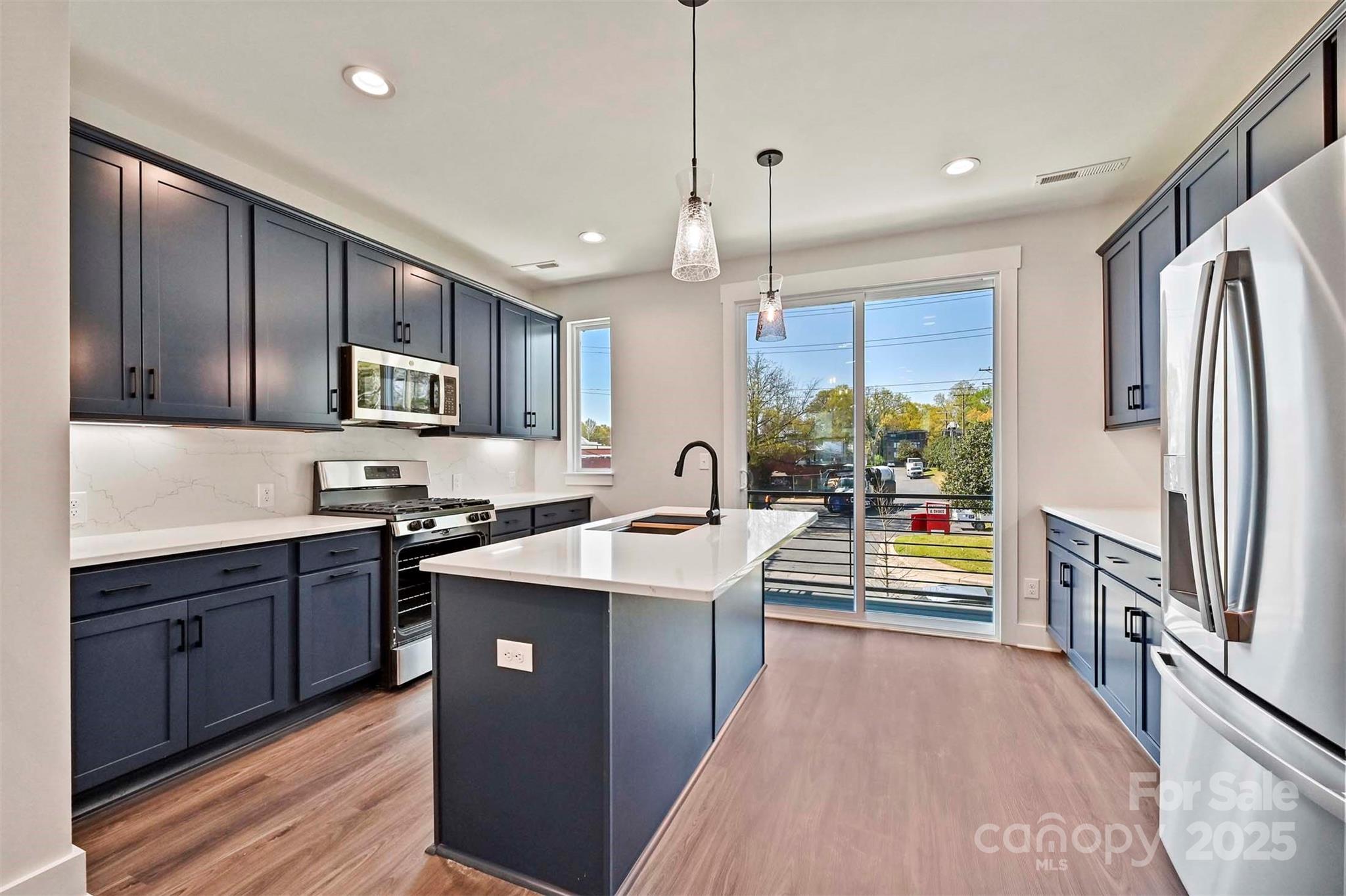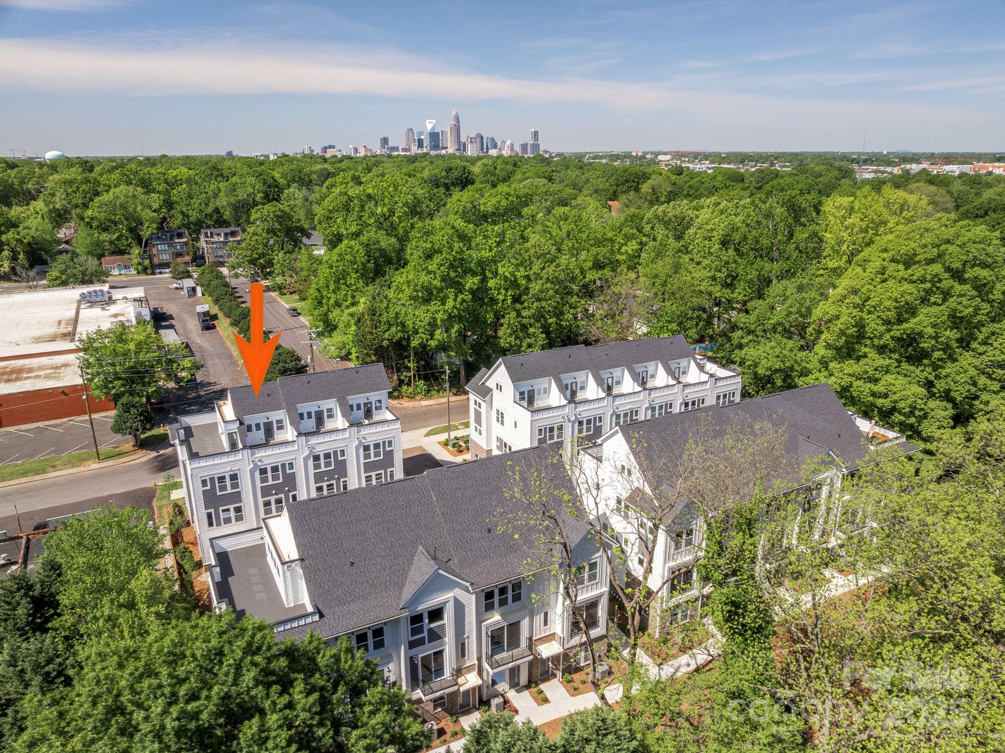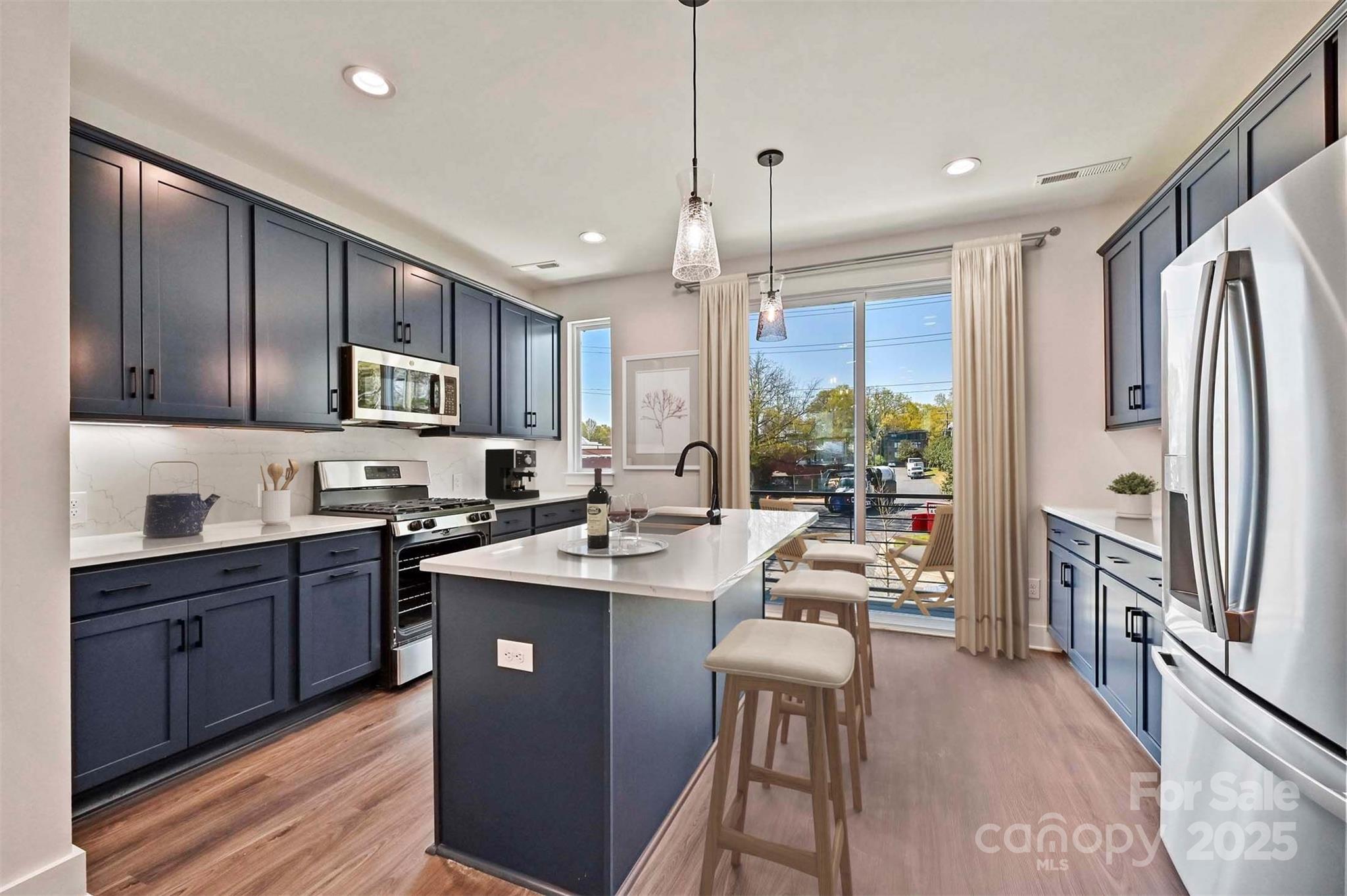 NoDa townhome offers 4-story living with 2 outdoor spaces. Make a statement in this bold kitchen, with 42" nautical blue cabinets & matte black hardware, quartz counters, LED under-cabinet lights, pantry, trash pullout, large undermount sink, & GE stainless steel appliances w/ gas range & fridge included. Off the kitchen is a small balcony with TREX decking. Nook by stairs/dining has space for a desk. 3rd floor has laundry w/ GE stacked washer/dryer included. Premier Suite has plenty of space for a king-sized bed; private bath features nautical blue cabinets, quartz counter, tiled floor & tiled shower. Guest bath is located next to the guest bedroom, w/ tiled floor & quartz counter. Great 4th floor w/ Rec room & Powder plus Rooftop Terrace w/ TREX; can double as a guest bedroom or home office. Walking distance to restaurants, with easy access to Uptown Charlotte and N. Davidson St. and Plaza Midwood. 2-car tandem garage PLUS private driveway is included! 9' ceilings throughout. LVP floors the 1st & 2nd floors & 3rd floor hall with oak treads on stairs.