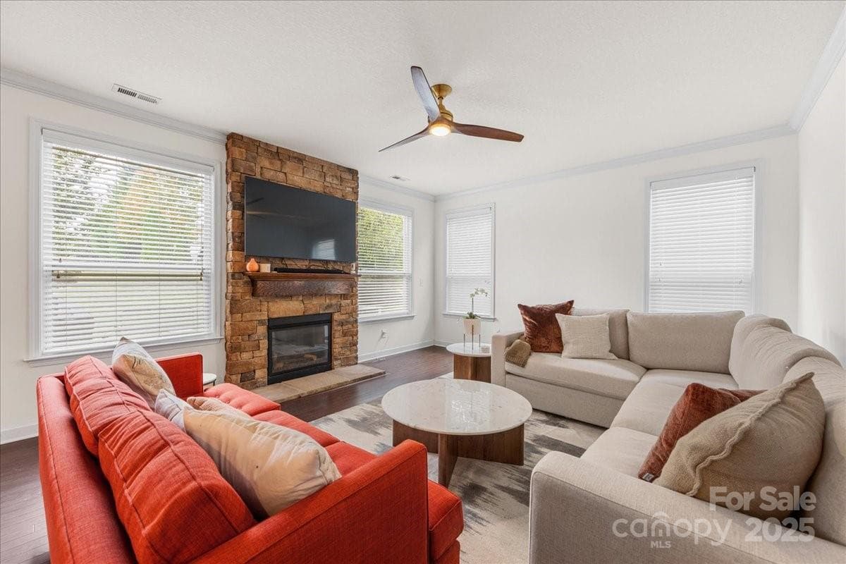 Move-in-ready home in the highly desirable Skybrook community! This light-filled home features hardwood floors, an open-concept main level, and a spacious family room with a stunning ceiling-height stone fireplace. The flexible dining/living room with tray ceiling offers space to entertain or create the layout you need. The kitchen flows into the breakfast area and sunroom, with a powder room nearby. Upstairs includes a versatile loft- perfect for office, fitness, or play-- plus luxurious primary suite with French doors, tray ceiling, and spa-inspired bath. Three additional bedrooms include one oversized room ideal as a bonus room. Attic pull-down access provides great storage. *** Seller willing to consider closing incentive of backyard fencing and/ or privacy plantings with acceptable offer. Located on a quiet street just steps from Skybrook's amenities: a swim & racquet club, golf course, Toptracer driving range, playground, paved trails, pond, and sports fields. Exceptional walkability to the golf, tennis and pool complex. A must-see home in one of Huntersville's most sought-after neighborhoods!