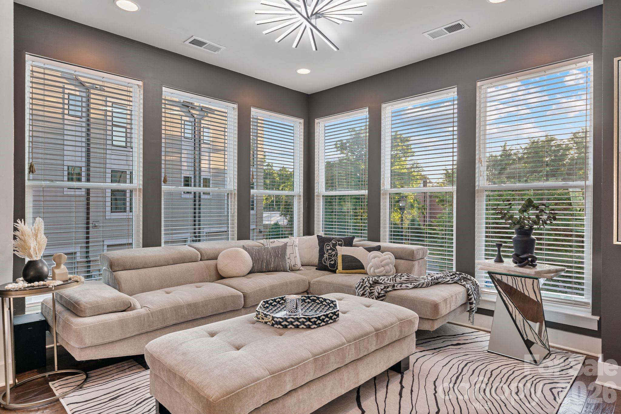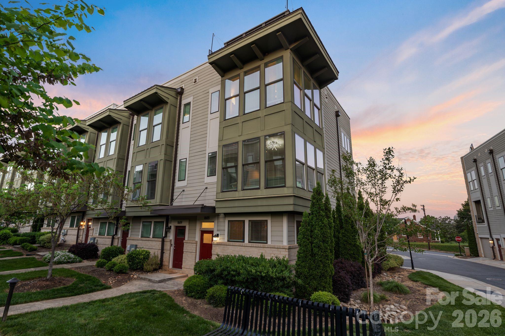Located in the heart of Wesley Heights, this fully upgraded townhome offers refined urban living just minutes from Uptown Charlotte. Set within a beautifully maintained community with lush landscaping and inviting green spaces, the residence blends modern design, elevated finishes, and exceptional outdoor living all with effortless access to major roadways and city conveniences. The interior is filled with abundant natural light, highlighted by a desirable corner position and expansive west-facing windows. The main level is designed for both everyday living and entertaining, featuring a spacious living area that flows seamlessly into a beautifully upgraded kitchen. Quartz countertops with waterfall edge detailing, a full-height stone backsplash, and updated West Elm lighting create a sophisticated aesthetic, while high-end appliances deliver both form and function. A custom bar with integrated wine display adds a distinctive touch, ideal for hosting. Just off the kitchen, a covered patio offers a comfortable outdoor retreat with views of Uptown. Upstairs, the primary suite is a serene escape, complete with designer finishes, dual closets, and a spa-inspired bath featuring a walk-in glass shower and dual vanities. A secondary bedroom functions perfectly as a guest space or office, enhanced with custom built-ins and direct access to the home’s standout feature, an extraordinary rooftop terrace. Outfitted with upgraded wood flooring, turf accents, and ambient string lighting, this elevated outdoor lounge captures breathtaking, unobstructed views of the Charlotte skyline, creating a true extension of the living space. The lower level adds versatility with a spacious bonus room, ideal for guests, a home office, or additional living space, along with direct access to a well-appointed garage featuring durable rubber flooring and ample storage. Throughout the home, thoughtful upgrades, including smart lighting, custom millwork, designer wallpaper, and a built-in security system, enhance both comfort and style. This stunning residence presents a rare opportunity to own a meticulously curated home in one of Charlotte’s most dynamic and connected neighborhoods.