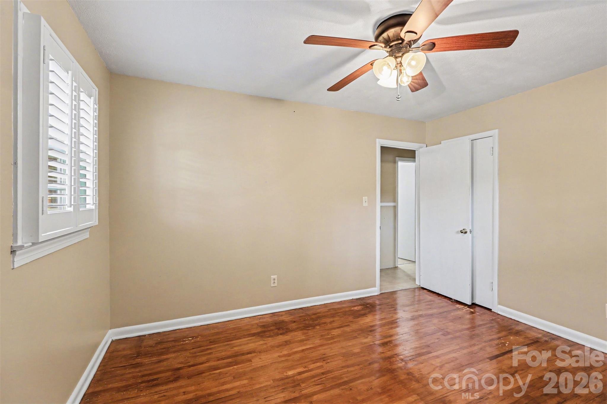 Move-in ready all-brick home ideal for a first-time buyer or investment opportunity. Lovingly maintained by only two owners, this home offers timeless character. Original hardwood floors run through the dining room and all three bedrooms. The kitchen features vinyl flooring and includes the refrigerator for the buyer. The living room has built-in bookshelves, carpeting, and views of the covered patio and beautifully private backyard. A half bath includes a laundry closet with convenient shelving and the washer and dryer are to remain in the home. Hall bath features a professionally renovated step-in shower (2025) with grab bars, along with classic original tile. Plantation shutters (2021) add charm throughout, and ceiling fans are in all bedrooms and the living room. Maintenance notes: HVAC (2004), roof (2010), windows (2010), and water heater (2013). Leaf guard gutters provide low-maintenance exterior care. Detached storage building with electricity offers added flexibility along with the utility room in the two-car carport.