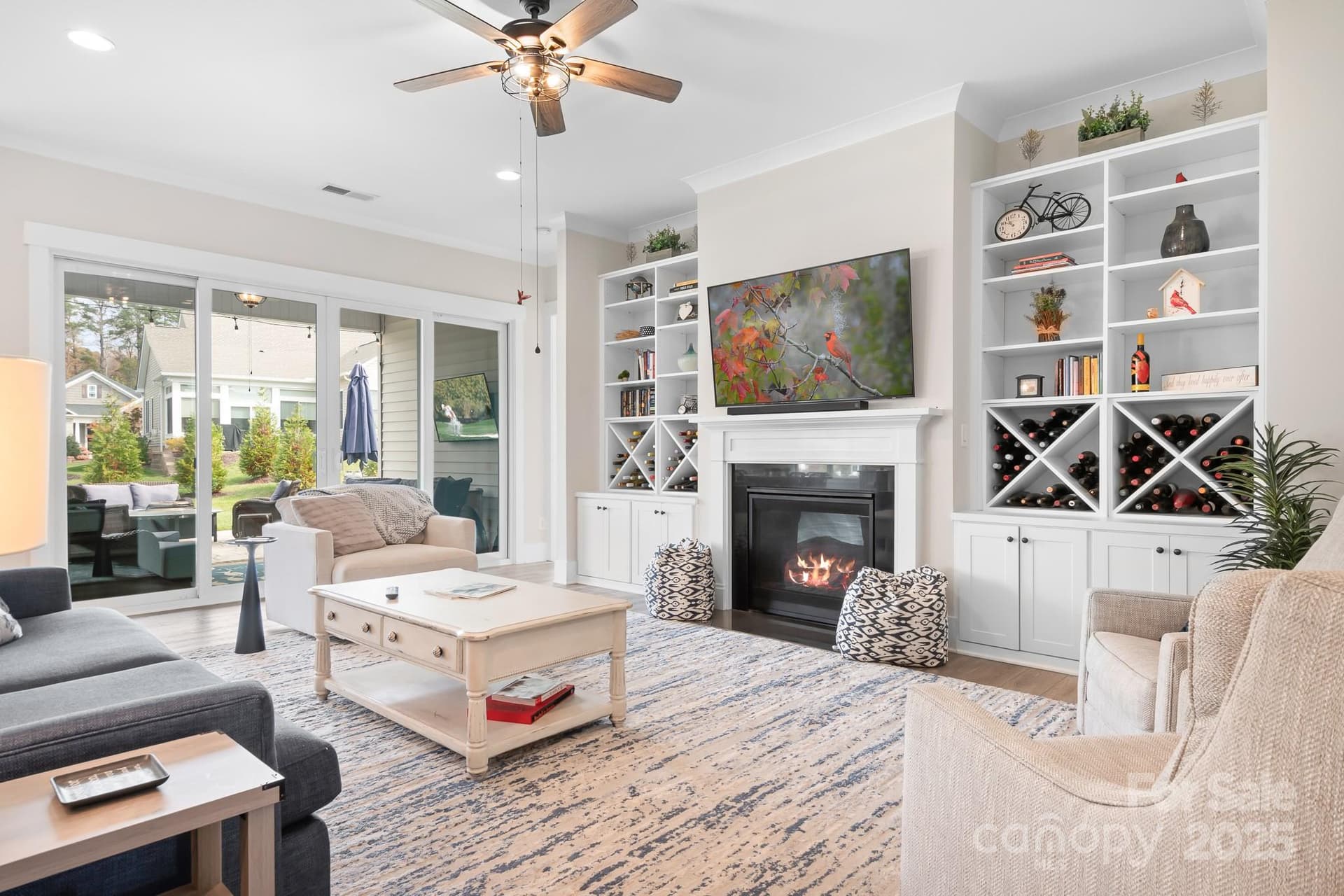 Welcome to The Forest at Bailey’s Glen! This stunning 2-story Carson model combines timeless charm with modern elegance. A sprawling rocking-chair front porch sets the tone for this inviting home, leading into a grand two-story foyer. Beautiful LVP hardwoods flow throughout the main living areas, complementing the open-concept design that’s perfect for entertaining. The gourmet kitchen is a showstopper, featuring white soft-close cabinetry, a sleek tile backsplash, white quartz countertops, and a spacious island with a farmhouse sink. Enjoy a gas cooktop, double oven/ built-in microwave, and a wine fridge. The great room offers the perfect gathering space with a cozy gas fireplace, custom built-ins, and plenty of sunlight. Open the sliding doors to a stamped-concrete patio ideal for outdoor dining or relaxing with friends and family. The main-level primary suite is a true retreat with dual custom closets and a spa-inspired bath featuring dual sinks and a walk-in shower with bench seating. A second bedroom, full bath, and flex/office room offer convenience and versatility on the main floor. The well-appointed laundry room includes a sink, front-loading washer and dryer, and even a laundry chute from the primary suite. Upstairs, you’ll find a spacious bonus area perfect for a media or game room, a full bathroom, an office, and a third bedroom. From its thoughtful layout to its refined finishes, this home is designed for both comfort and connection—truly a gem in one of the area’s most sought-after active-adult communities.