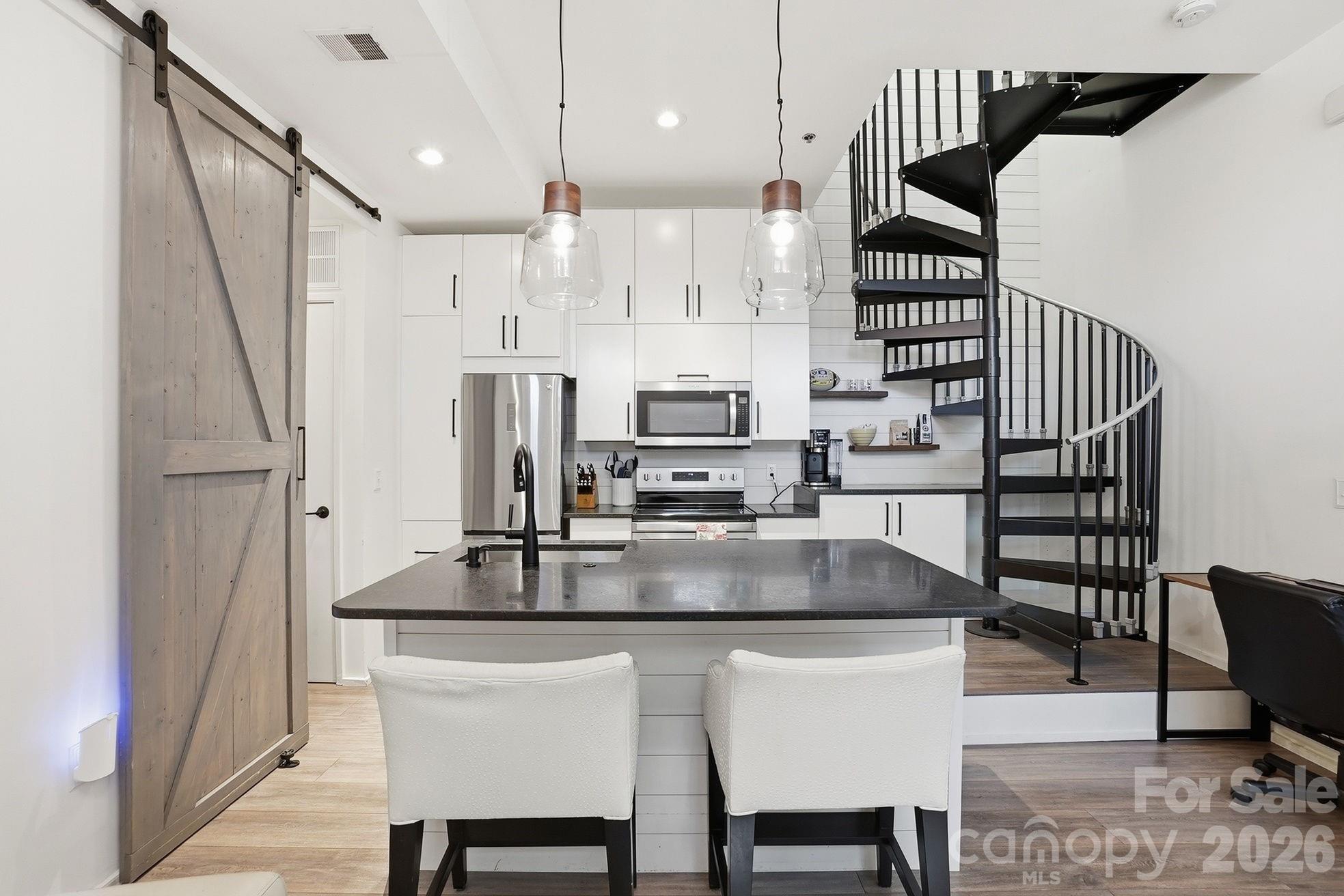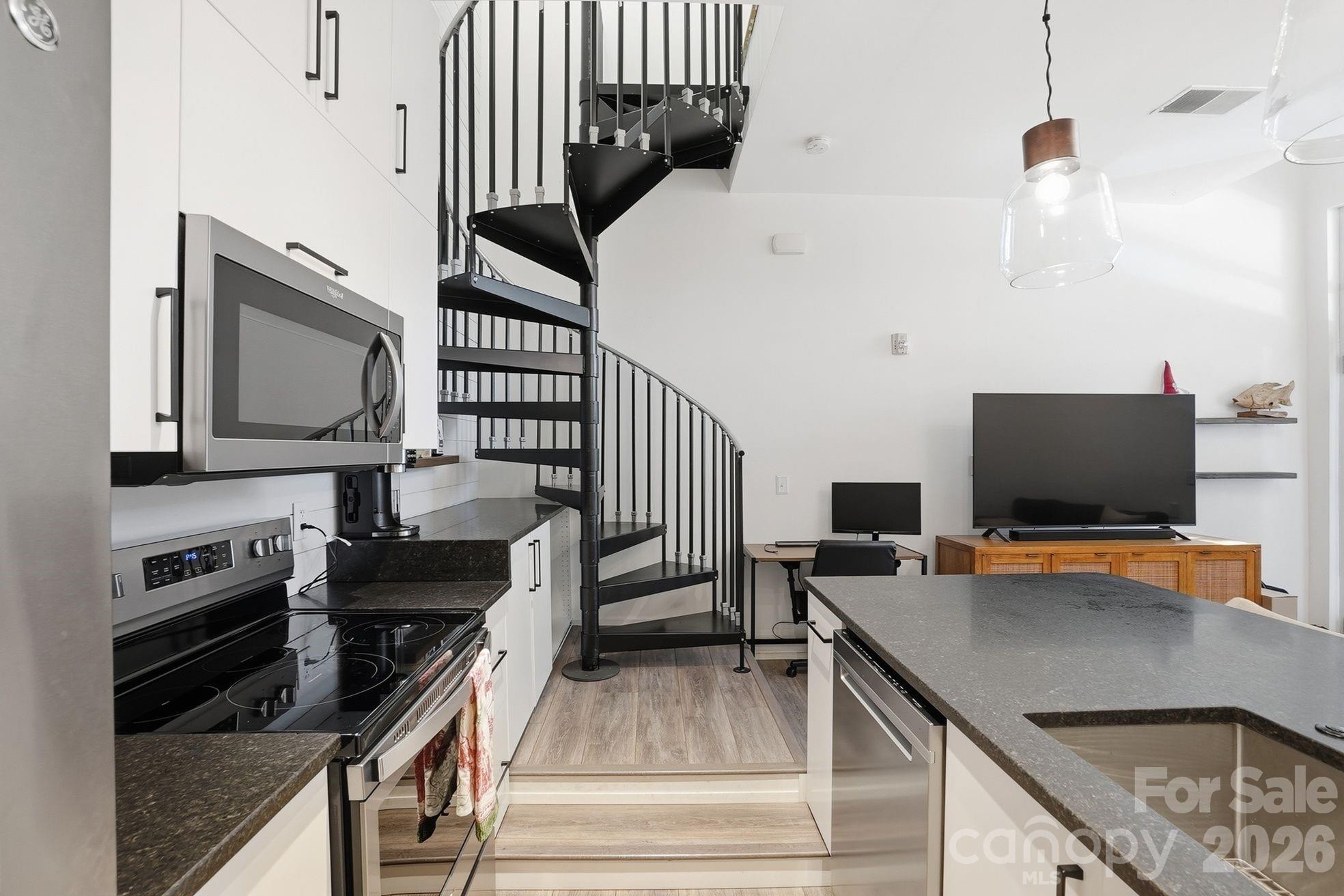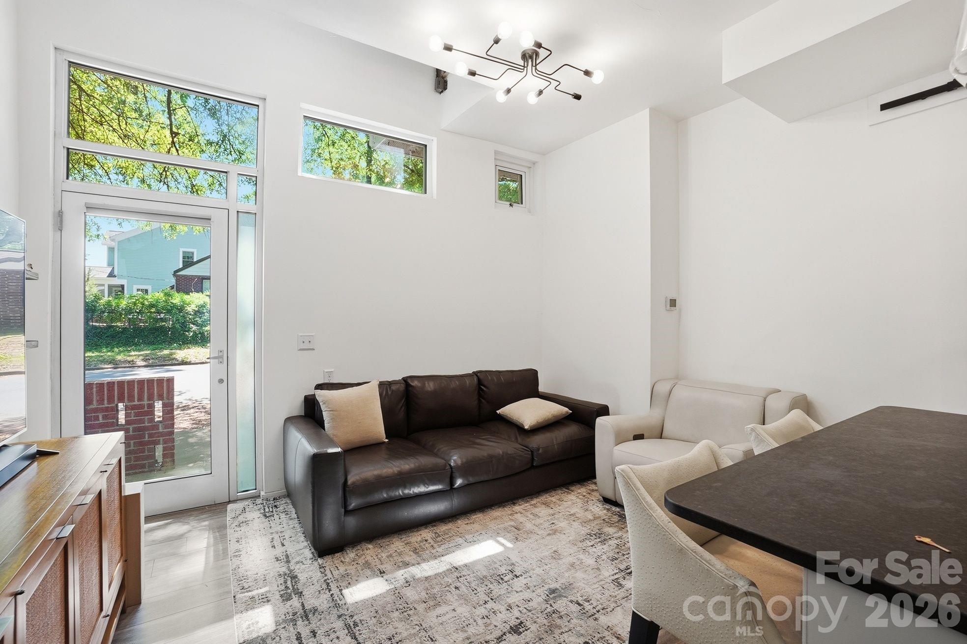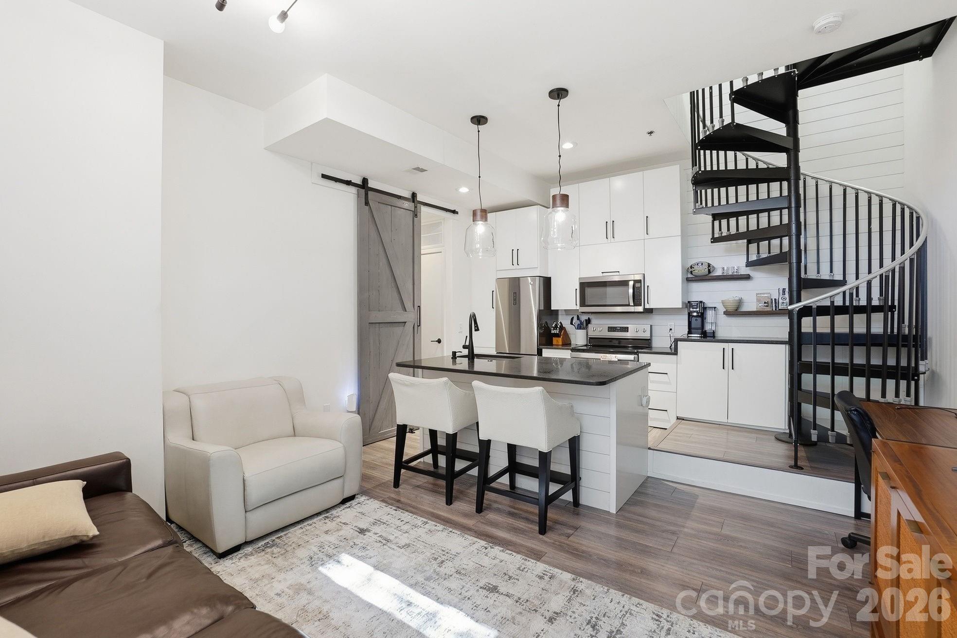 Tucked in the heart of Dilworth — steps from South End’s best restaurants, coffee shops, and the Light Rail — this two-story condo offers the kind of low-maintenance, lock-and-leave lifestyle that’s genuinely hard to find. A striking spiral staircase anchors the open main level, where a renovated kitchen (2018) flows into a bright, welcoming living space made for both everyday living and easy entertaining. Upstairs, the generous primary bedroom opens to a private balcony — your spot for morning coffee or evening wind-downs — alongside an updated bath (2018) with a walk-in shower and custom closet cabinetry. The big-ticket items are already handled: HVAC, water heater (2022), and brand-new washer and dryer (2026). A covered carport with one assigned space plus easy street parking rounds it out. Water, trash, and recycling included in HOA.