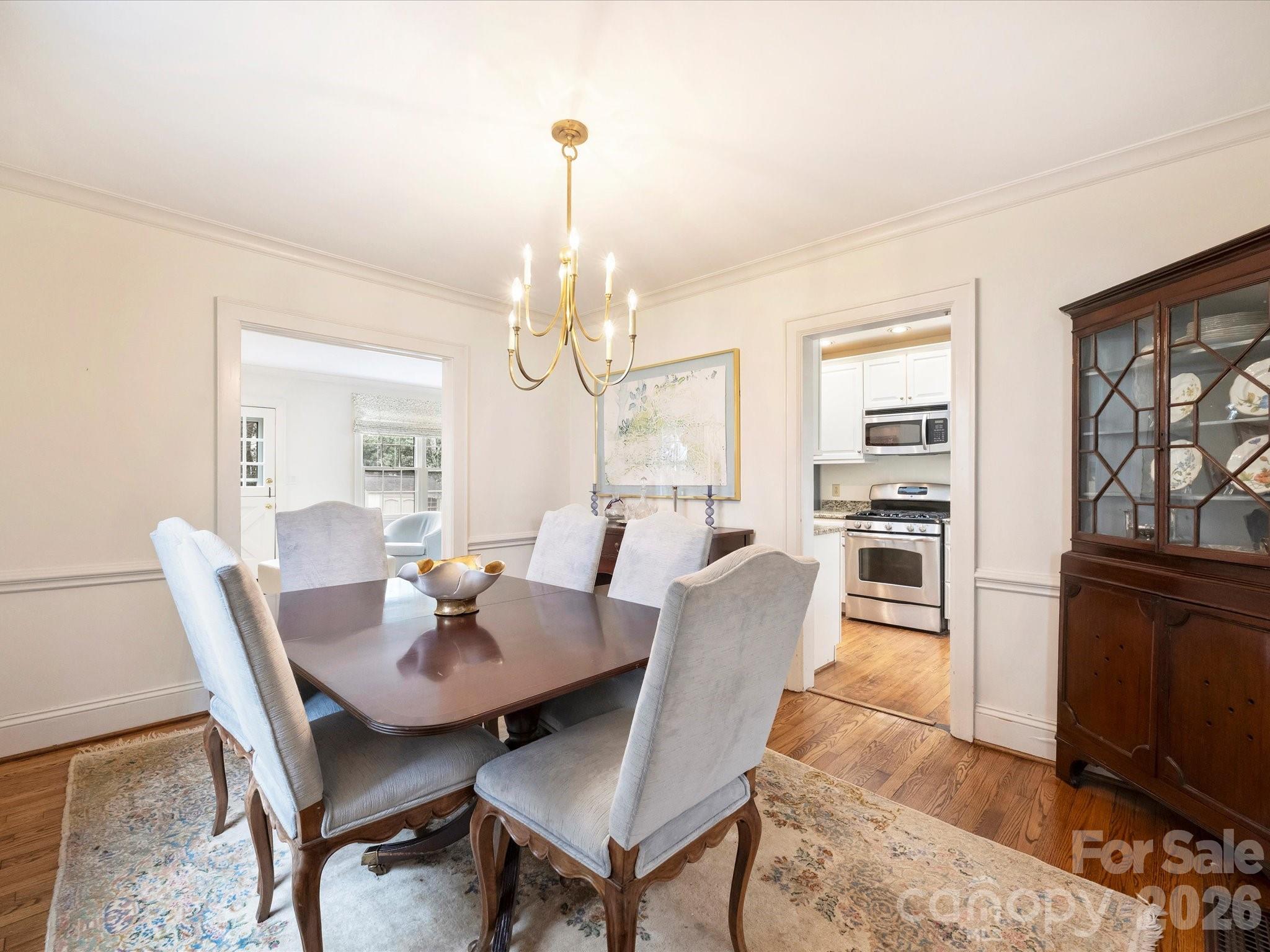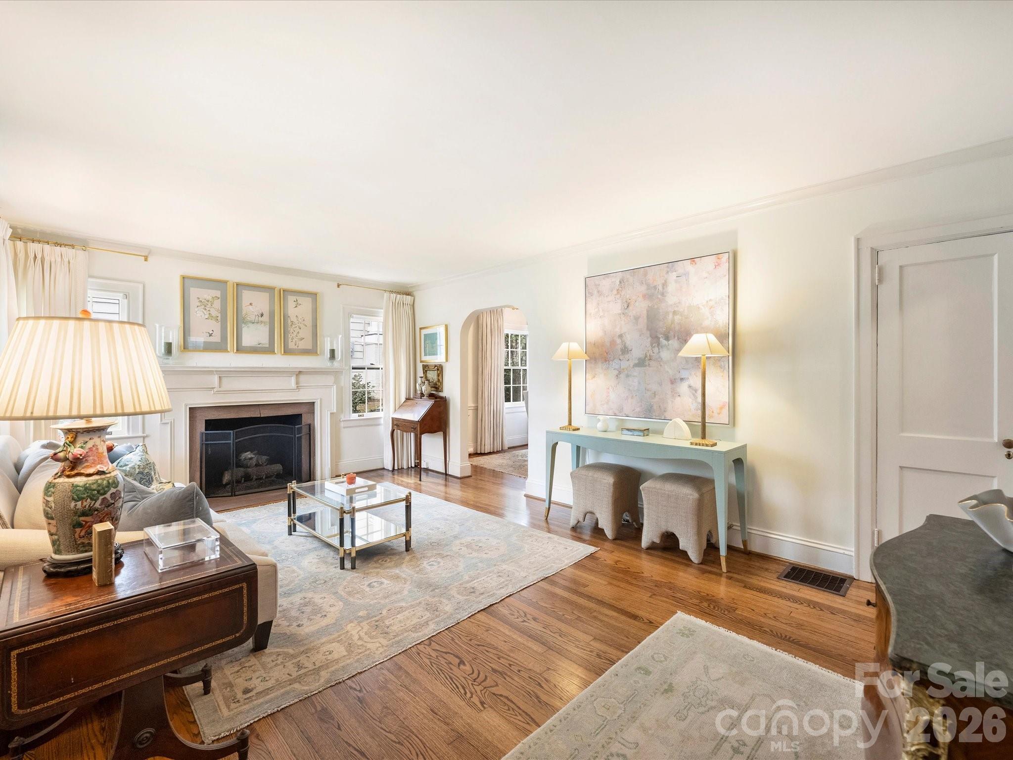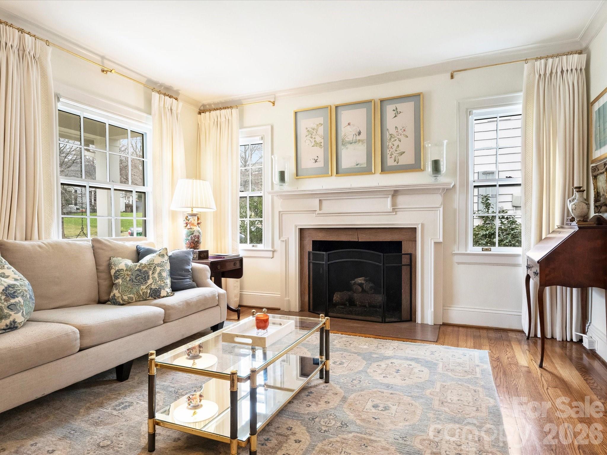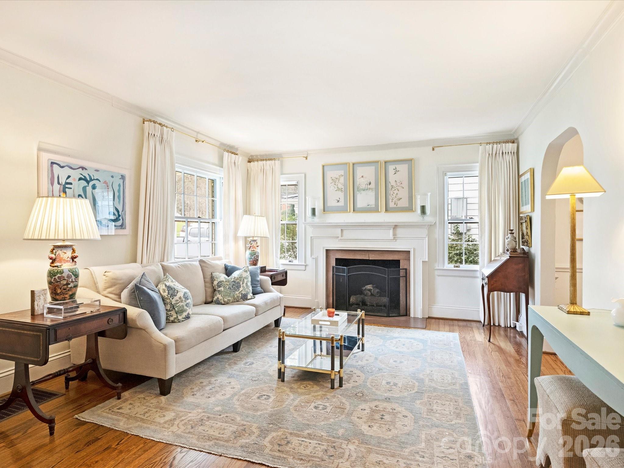 Welcome to this charming home in the heart of Myers Park. From the covered front porch you enter into a stately living room featuring a fireplace with wood mantel and marble surround. The formal dining room, highlighted by an elegant chandelier, leads to the updated kitchen with granite countertops, white cabinetry, stainless steel appliances, a pantry with custom built-ins, and a skylight that fills the space with natural light. The family room at the rear of the home offers built-in bookshelves with storage, custom window treatments, and opens seamlessly to the bluestone patio and meticulously maintained backyard - ideal for indoor-outdoor living. The primary suite features a spacious closet with custom built-ins and a timeless primary bath with updated tile, countertops and light fixtures. One of the two secondary bedrooms includes built-ins, custom window treatments, and a deep closet. A full bath showcases a pedestal sink, original tile, and tub. Walk-up attic provides exceptional storage.