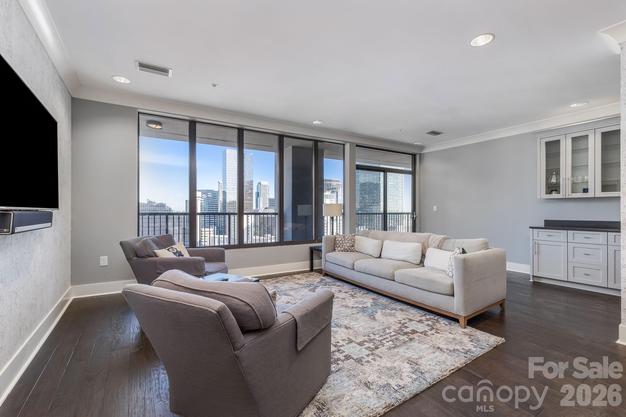 Located on the coveted 20th-floor Club Level of SKYE Condos, this beautifully appointed 2-bed, 2-bath residence offers elevated city living just below the penthouse floor. The Club Level features fewer residences, larger floor plans, and a higher level of finish than lower floors, creating a more private, upscale feel. Enter through a formal hallway into an open-concept living space with floor-to-ceiling windows showcasing breathtaking Uptown skyline views. The kitchen is designed for both everyday living and entertaining, featuring gas cooking, an oversized island, and bar area. The main living area opens to one of the larger city view balconies—perfect for sunrise coffee or evening city lights. A 5x3.5 storage unit as well as two parking spots come with the condo for added convenience. Residents enjoy resort-style amenities including 24-hour concierge, fitness center, theater, and a rooftop terrace as well as a short walk inside the building to one of Charlotte’s best restaurants, Fahrenheit. City-view Club Level units command a premium—and opportunities like this are rare.
