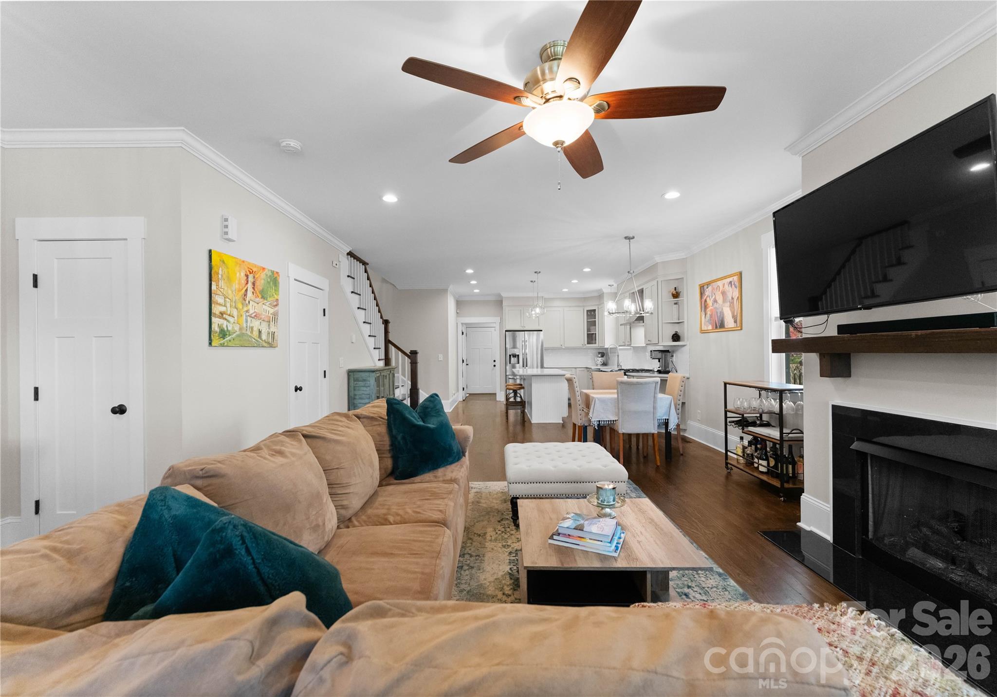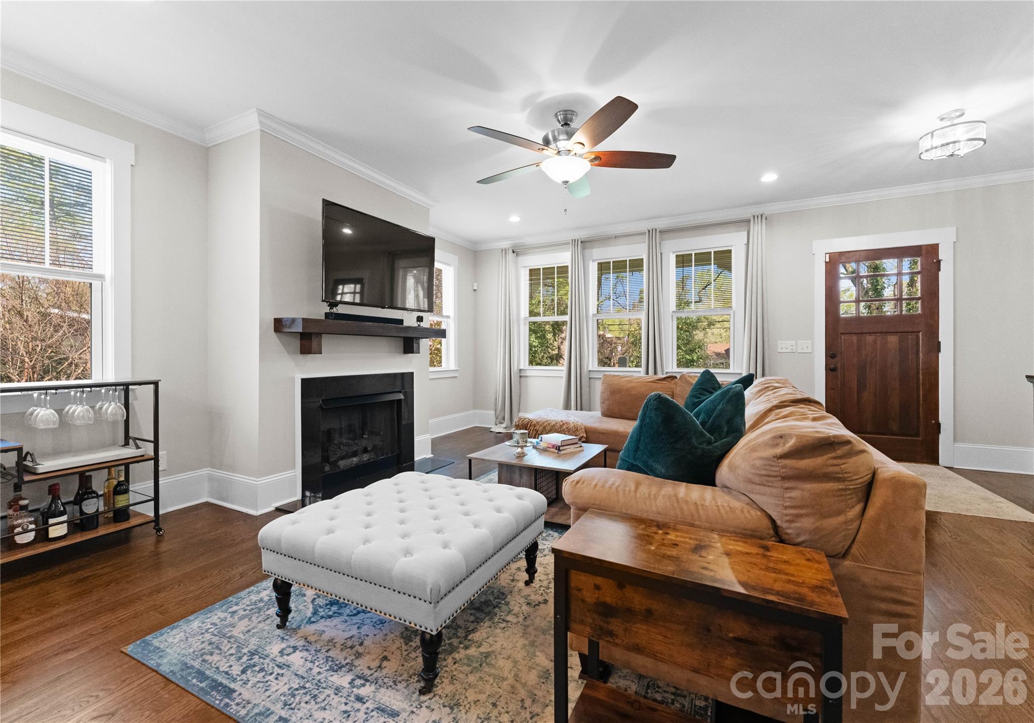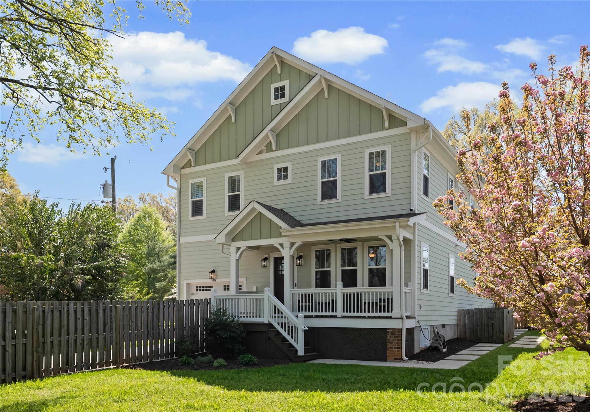 Welcome to this stunning custom duet home in Charlotte’s highly coveted Historic Camp Green, just minutes from Uptown and surrounded by dining, shopping, and parks. Designed with modern living in mind, this home features 9’ ceilings, an open-concept floor plan with a spacious great room and cozy gas-log fireplace, and a chef-inspired kitchen with quartz counters, farmhouse sink, stainless steel appliances including a gas range and vent hood, and a large island perfect for entertaining. Thoughtful upgrades include soft-close cabinetry, hardwood floors throughout main and common areas, and elegant trim and moldings. The main level also offers a convenient half bathroom and laundry area. Upstairs, the luxurious primary suite impresses with dual vanities, a separate shower and soaking tub, and custom closet, complemented by two spacious secondary bedrooms, a full guest bath, and a versatile flex space. Enjoy rare privacy in the fenced front and side yard with a covered porch ideal for relaxing or entertaining. Positioned across from the historic Dowd House and county park with no HOA fees and easy access to Wilkinson Blvd, Morehead Street, and major highways, this beautifully appointed home combines the charm of a historic neighborhood with the best of modern convenience!