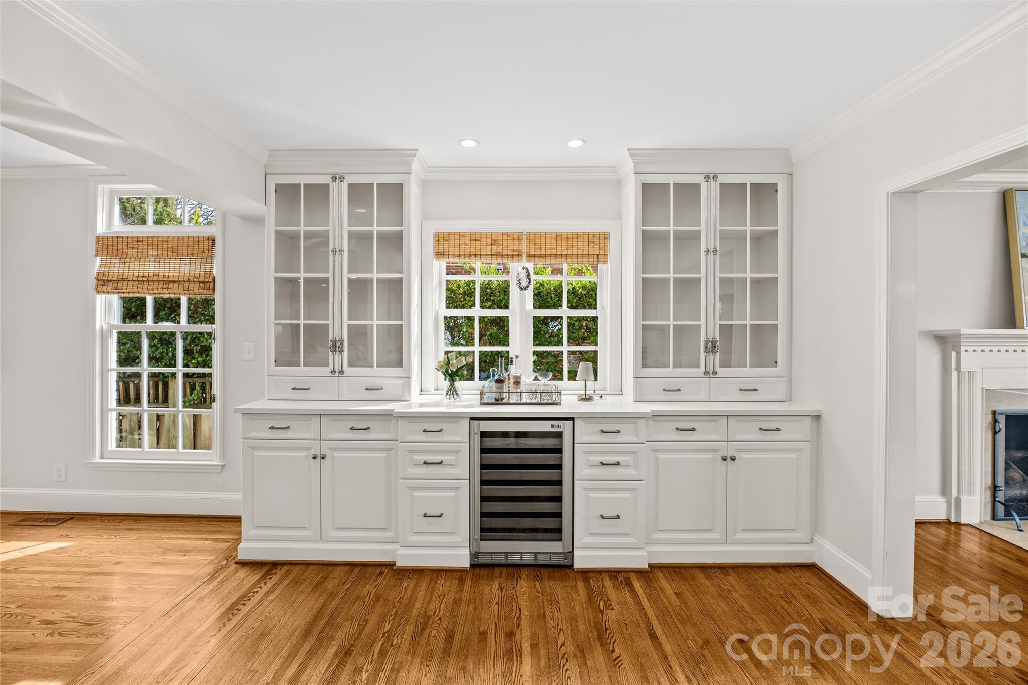 Situated on Hampton Avenue in the heart of Myers Park, this beautifully updated 4-bedroom, 3.5-bath traditional home is completely move-in ready and thoughtfully designed. The desirable open floor plan features hardwood floors, ornate custom moldings, and tasteful finishes throughout. Formal living and dining rooms each with gas fireplaces provide the perfect space for entertaining, while the expansive kitchen serves as the centerpiece of the home with white custom cabinetry, quartz countertops, center island, and high-end stainless appliances including a Wolf gas range and Sub-Zero refrigerator. The kitchen flows seamlessly into the sprawling dining area and family room, offering exceptional flexibility for everyday living. Additional highlights include a private office with built-ins and spacious laundry room/drop zone with abundant storage. Upstairs offers a serene primary suite with fireplace, walk-in closet, and spa-inspired bath plus three secondary bedrooms and bonus room. Outdoors, enjoy a fully fenced, turfed backyard with mature landscaping, spacious brick patio, outdoor fireplace, and built-in grilling station. Ideally located near Uptown and SouthPark, this home blends classic charm with modern comfort.