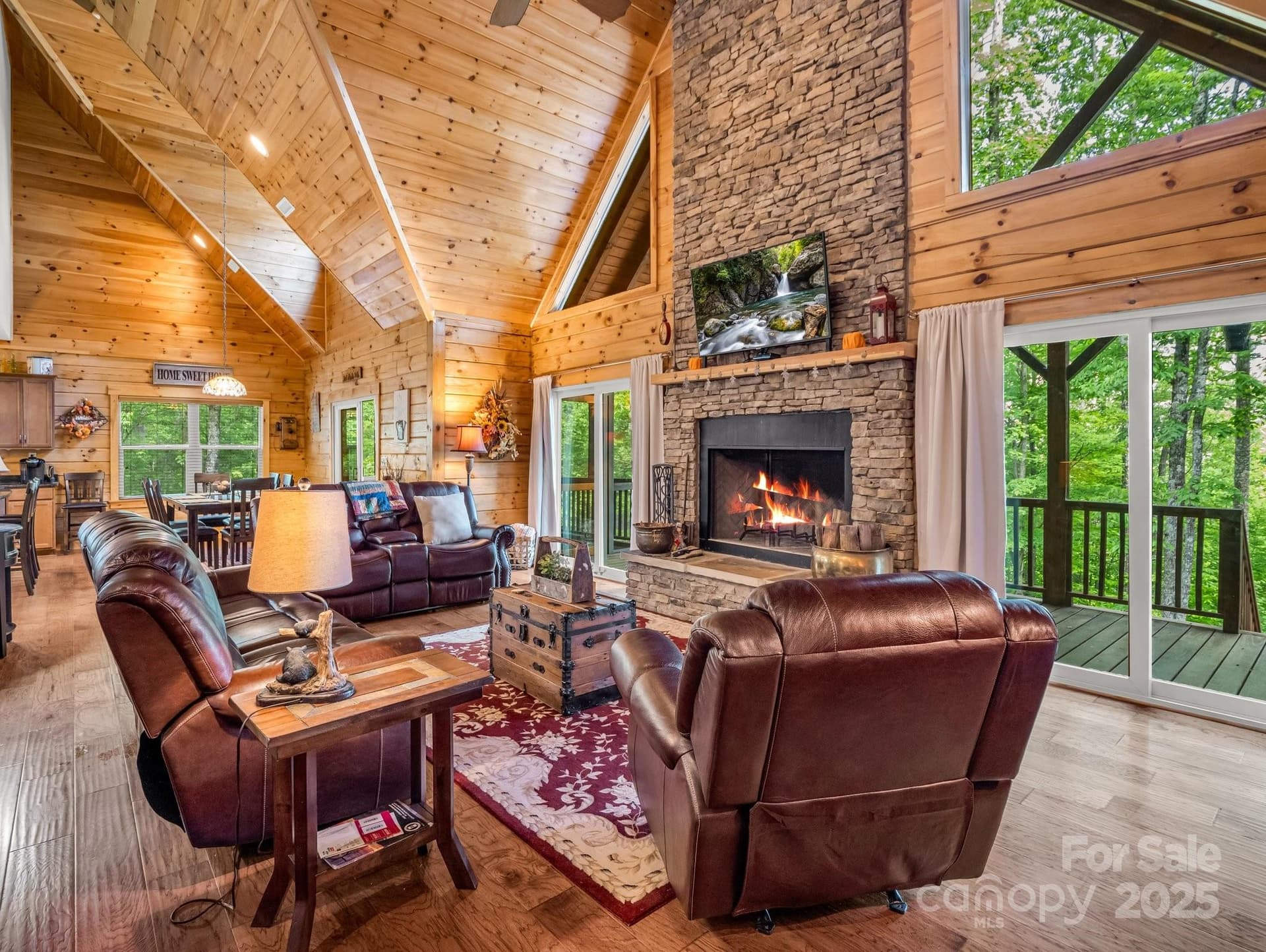 This thoughtfully designed immaculate log cabin home offers warm wood interiors, wood floors and a stone wood-burning fireplace. The chef’s kitchen is equipped with stainless steel appliances, a gas range, wine refrigerator and walk-in pantry. The primary suite includes double vanities, a tiled walk-in shower and a spacious closet with island storage. Three additional guest bedrooms, a loft and generous living spaces provide comfort and flexibility. Outdoor living features two screened-in decks, a lower-level open deck, fire pit and seasonal mountain views—ideal for entertaining or quiet retreats. Circular driveway and two-car garage, featuring a finished bonus room above. This The home balances rustic charm and modern amenities in a serene setting. All this plus the amenities of a private beach, two 18-hole golf courses, on site restaurants, Lazy River, volleyball, basketball, miniature golf, indoor & outdoor pools, fitness center, spa and beauty salon, and more.