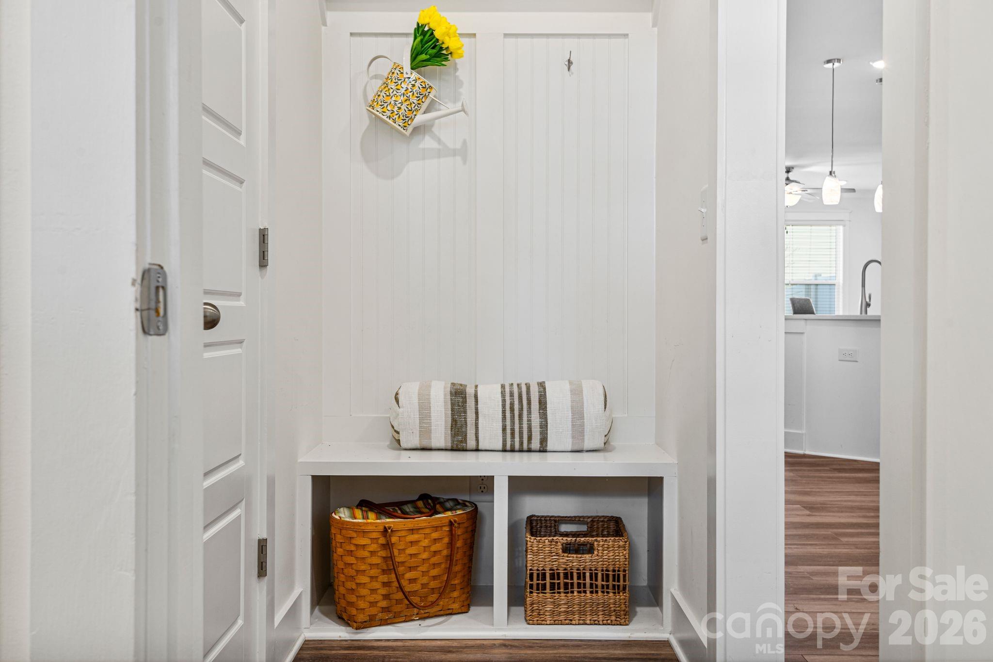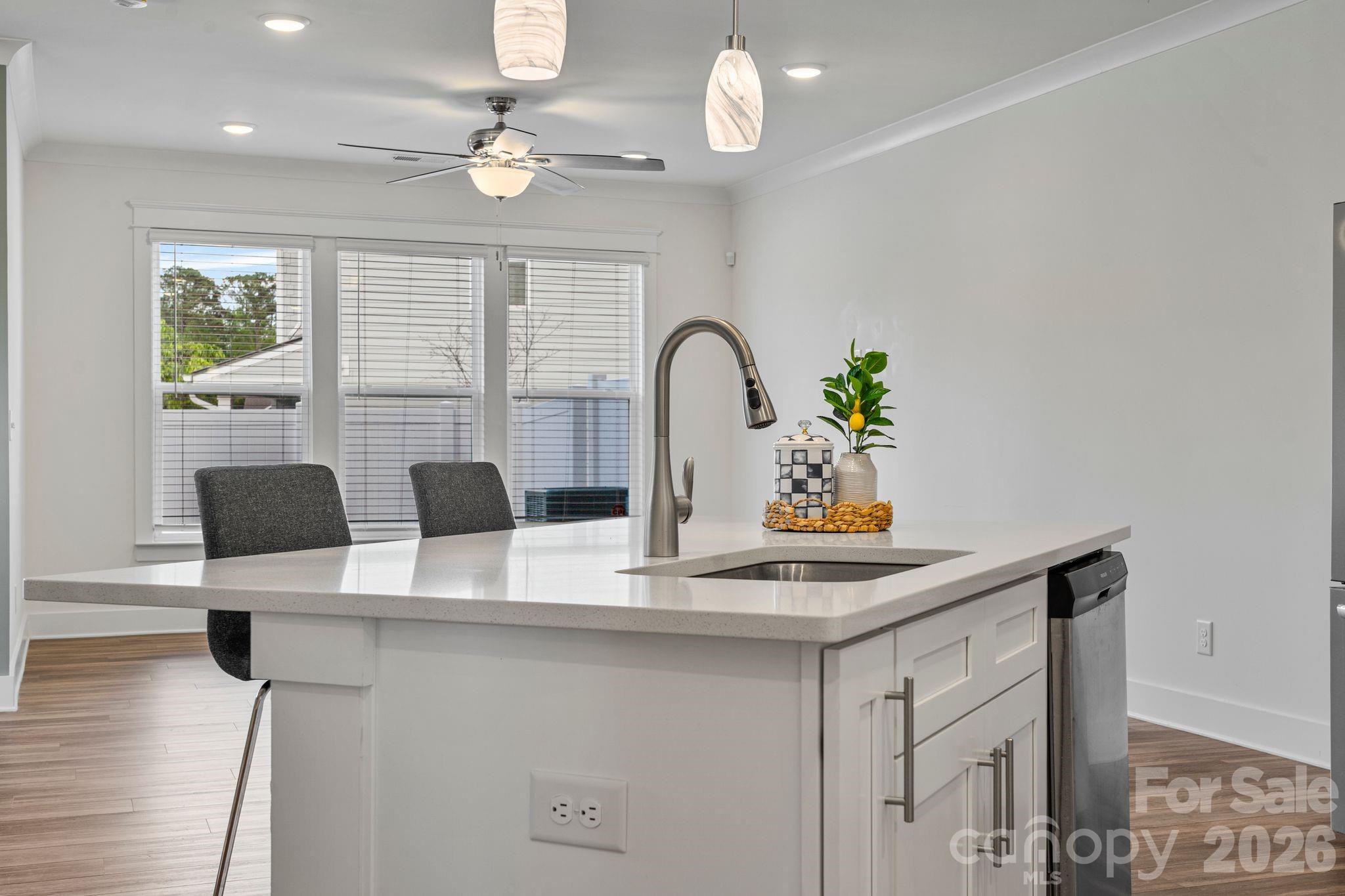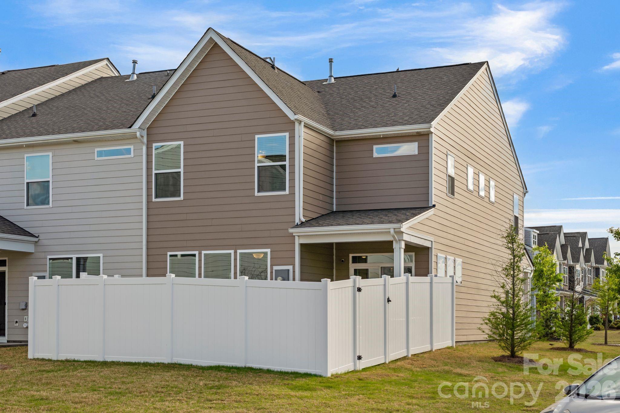 There's a version of home ownership where everything is already handled. The fence is in. The blinds are hung. The garage is finished. You open the door and the space receives you. 6211 Nandina Drive is that home. Ready for you to make it yours from day one. No wait. No add-ons. No upgrade costs. Just the foundation of a settled life, already laid out and waiting for you. The kitchen is where this home earns its reputation. Gas range, quartz countertops, marble subway tile backsplash, and an island with undermount sink and pendant lighting above. The family room opens directly to it so whoever's at the barstools stays in the conversation, whoever's cooking never misses a moment. The dining room carries its own personality, anchored by a chandelier and sliding glass doors that open to the covered patio and private fenced yard beyond. Inside and outside, the flow between them is seamless. Upstairs, the open loft creates breathing room. A second living area, a home office, a place for the household to spread out without losing each other. The primary suite is quiet and considered — frameless glass walk-in shower with built-in bench and mosaic accent tile, double vanity with quartz counters, natural light from a well-placed window. The secondary bath offers a full tub-shower combo with large-format tiled surround and niche shelving. Every finish chosen with intention. Off the garage entry sits a built-in mudroom that quietly holds the household together. Beadboard paneling, a bench, two cubbies beneath. The detail you don't know you need until you have it every single day. As an end unit, this home lives larger than its footprint. More windows. More light. More separation. And the location within the community is its own reward located directly across from the walking trail, pool, dog park, and green space. Not a drive. Not even much of a walk. Just across the street. Harrisburg schools. Minutes from shopping, dining, and UNC Charlotte. A neighborhood with a genuine sense of community and the quiet to match. 6211 Nandina Drive isn't waiting to become something. It already is.