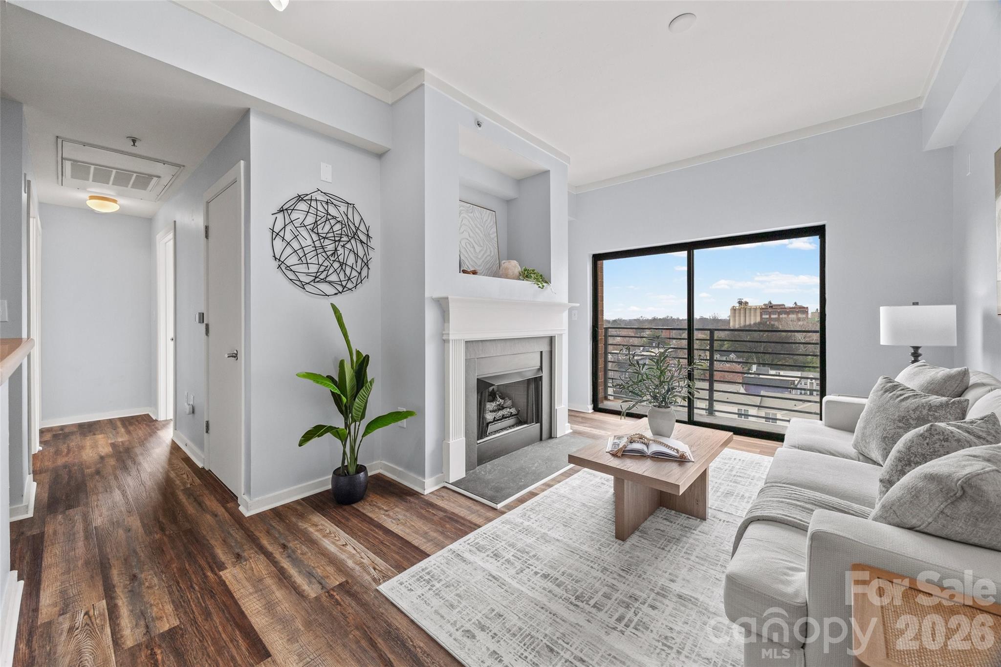 Located on the 7th floor corner of a beautiful Fourth Ward building, this two-bedroom, two-bathroom condo offers stunning year-round views of the Uptown skyline. The home features neutral paint tones, updated flooring, and plenty of natural light throughout. The living room includes a gas fireplace and direct access to a private balcony overlooking the community pool. The kitchen is equipped with white cabinetry, stainless steel appliances—including a 2021 gas range and a 2024 dishwasher—and the refrigerator will remain. A convenient laundry closet contains a stackable washer and dryer (2022), which will remain. The primary bedroom sits on the corner of the unit and features windows along two walls, a closet, and an ensuite bathroom with a shower. The secondary bedroom also enjoys Uptown views and is served by a hall bathroom that includes a large vanity and a tub/shower combination. The secure building offers controlled key-fob access, a welcoming lobby, elevators, an outdoor pool (with new pool furniture arriving soon!), and a parking garage. This condo includes one assigned parking space. The unit is also just one flight of stairs or a quick elevator ride to the rooftop terrace, where residents can enjoy Uptown views or make use of the grilling station. The HOA recently installed a new roof. Fourth Ward is known for its charming neighborhood parks, delicious restaurants, and lively seasonal festivals. The condo is located less than half a mile from the 9th Street light rail station and offers easy access to everything Uptown has to offer—including sporting events, nightlife, dining, and the arts.